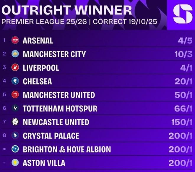 排名第4的則是切爾西,賠率為1賠20;而曼聯在擊敗利物浦後,賠率已經上升至第5位,甚至超越瞭熱刺,賠率為1賠50。熱刺、紐卡、水晶宮分別排名第6至第8位。