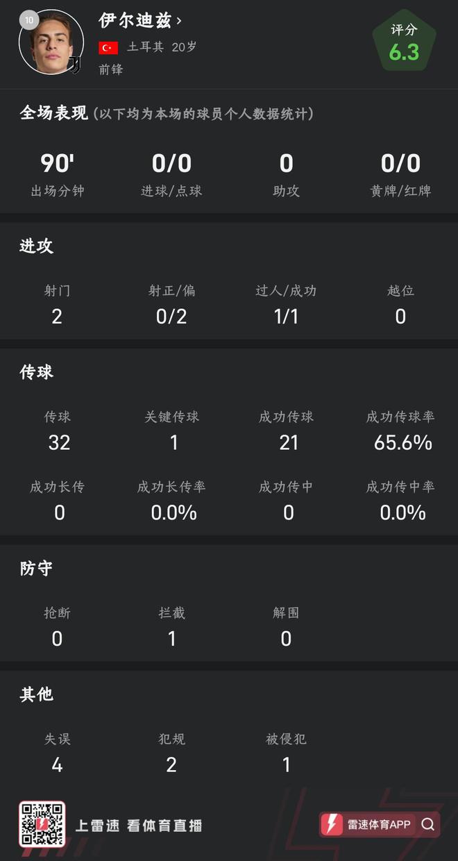 伊爾迪茲同樣踢滿90分鐘,全場2次射門全部射偏。1次嘗試過人且成功。傳球方面,伊爾迪茲全場32次傳球,其中21次傳球成功(含1次關鍵傳球),傳球成功率65.6%。防守端,伊爾迪茲全場僅完成1次攔截。此外,伊爾迪茲全場4次失誤、2次犯規且1次被侵犯。
