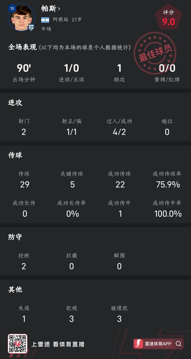 但在臨場對決中,阿根廷新星帕斯的表現完全碾壓土耳其新星伊爾迪茲。帕斯此役踢滿90分鐘貢獻1射1傳。帕斯全場2次射門1次射正攻入1球,4次嘗試過人其中2次過人成功。傳球方面,帕斯全場完成29次傳球,22次傳球成功(含5次關鍵傳球、1次助攻),傳球成功率達到75.9%。此外,帕斯此役2次搶斷、3次被侵犯,另有1次失誤及3次犯規。