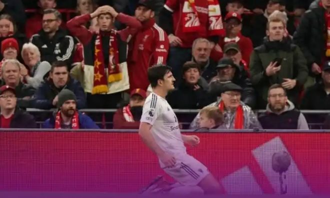 就此,馬奎爾破門給出瞭滑跪慶祝,而現場的曼聯球迷也是非常瘋狂的相擁、吶喊。