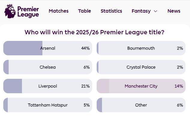 誰能奪冠?英超官網球迷投票:槍手44%第一,紅軍21%曼城14%