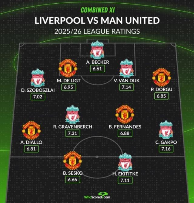 10月19日訊 本輪英超將上演曼聯與利物浦的焦點對決,數據網站Whoscored也盤點瞭兩隊球員本賽季英超場均評分最高陣容,具體如下: